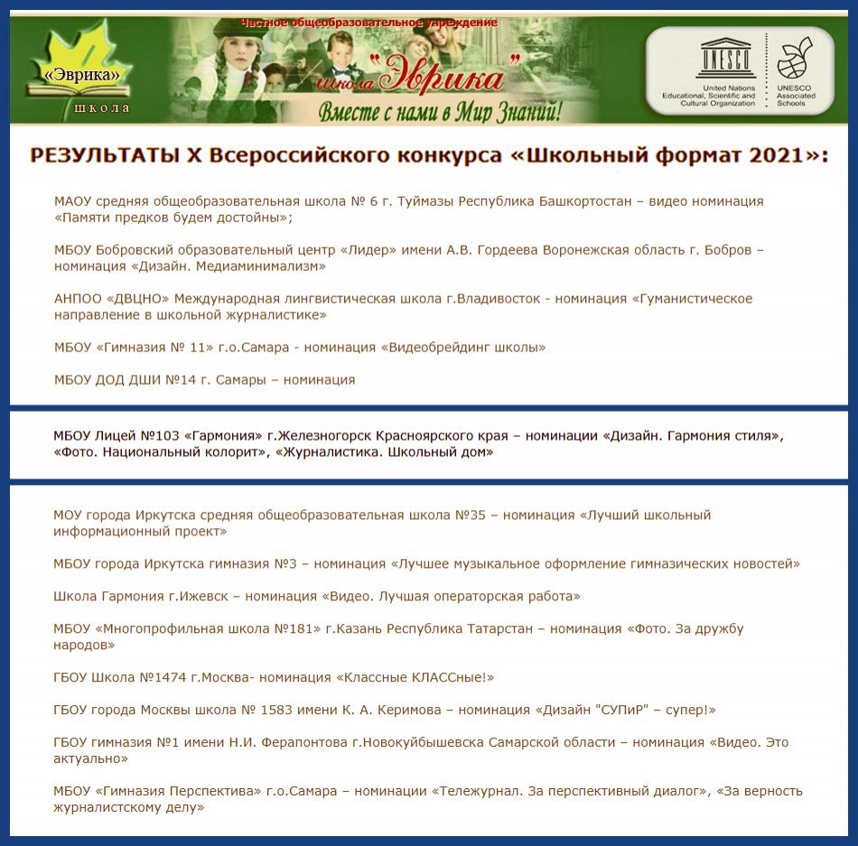 • МБОУ Лицей №103 «Гармония» г.Железногорск Красноярского края – номинации «Дизайн. Гармония стиля», «Фото. Национальный колорит», «Журналистика. Школьный дом»