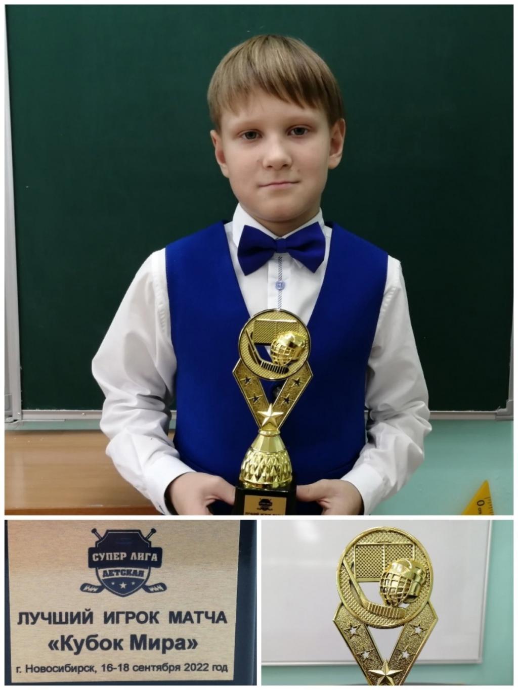 2. Ученик 4 "М" класса Владимир Шумелев принял участие в Детской Супер Лиге по хоккею и стал лучшим игроком матча! Соревнования проходили 16-18 сентября в городе Новосибирске.