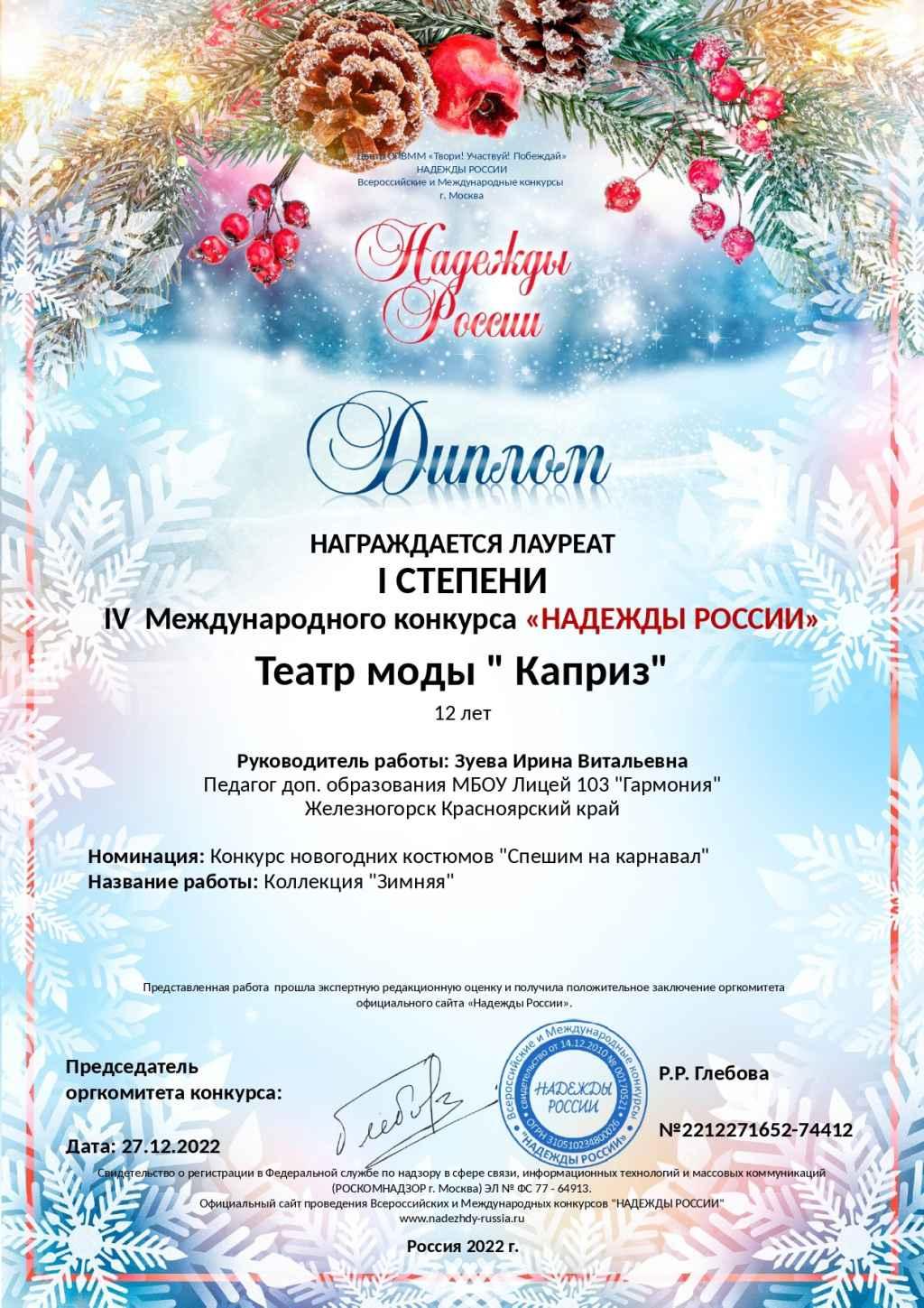 • Театр моды "Каприз" принял участие в IV международном конкурсе "Надежды России" и стал лауреатом I степени!