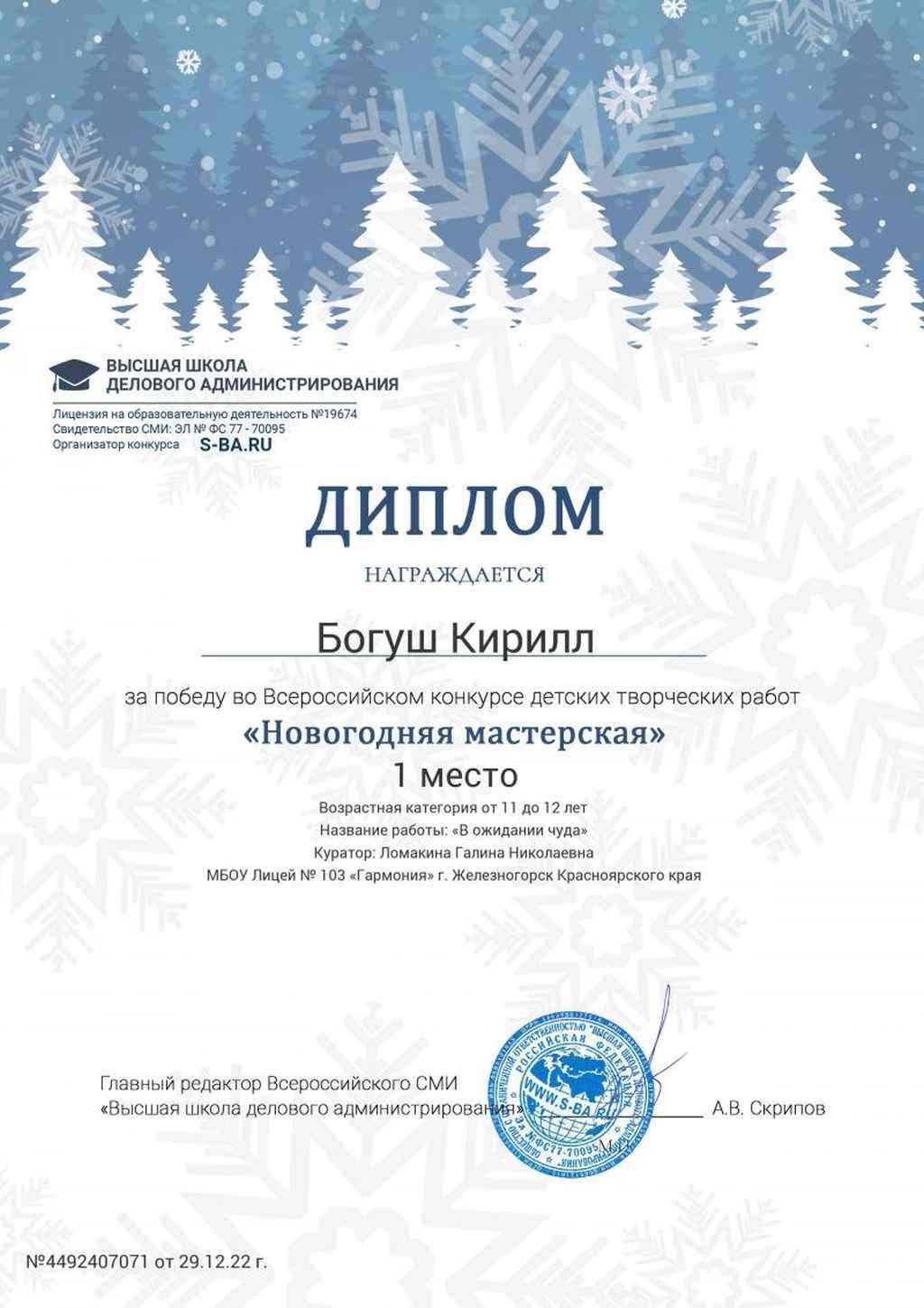 • Ученик 5 "А" класса Кирилл Богуш принял участие во всероссийском конкурсе детских творческих работ "Новогодняя мастерская" и стал победителем!