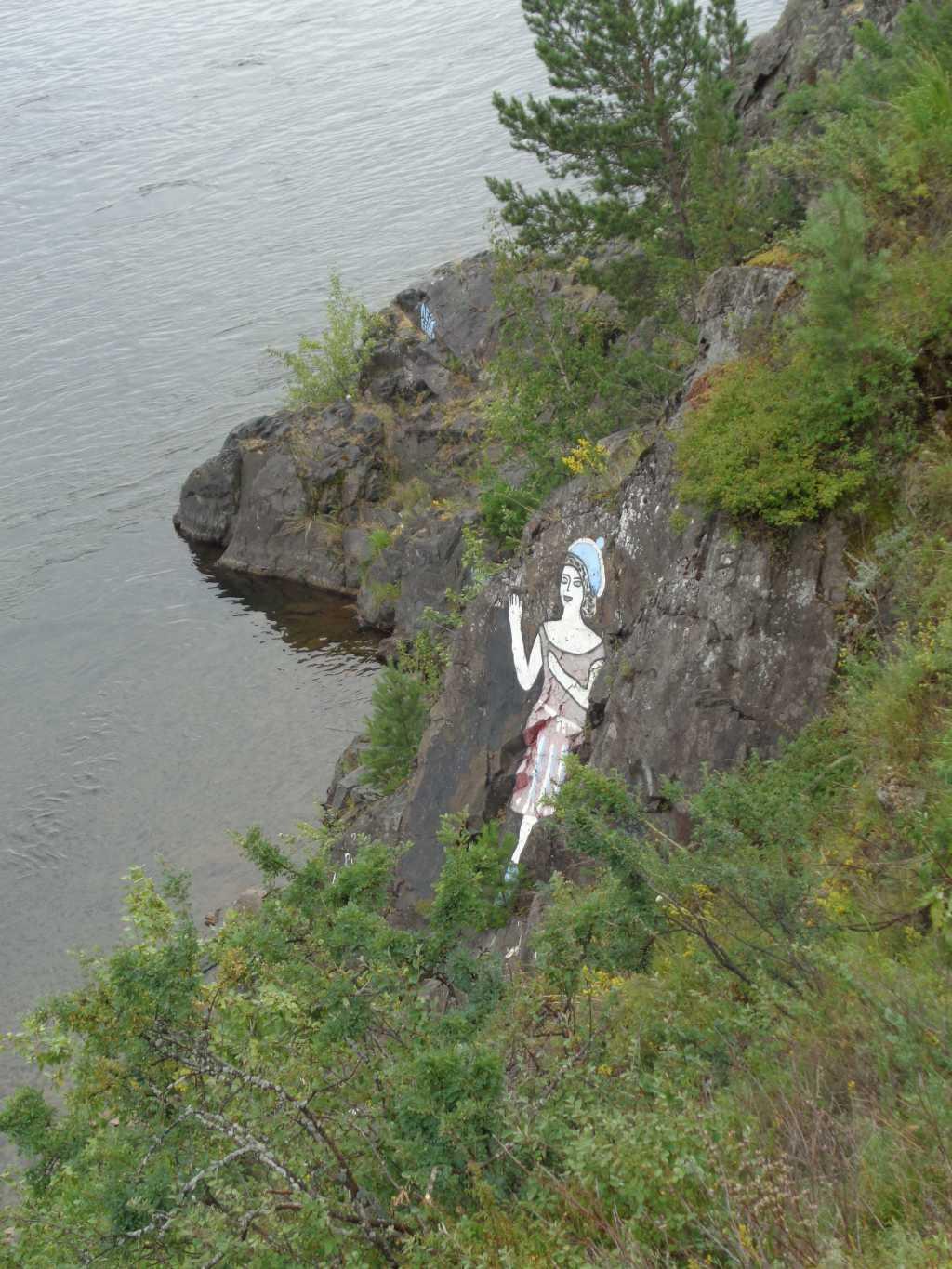 И, конечно, был поход на барыню, т.е. поход к скале, на которой художник изобразил свою возлюбленную. По легенде, девушка, разлученная со своим любимым, бросилась со скалы в реку, а парень нарисовал её потом на скале и, каждую зиму рисовал ей шубку, а летом – сарафан!