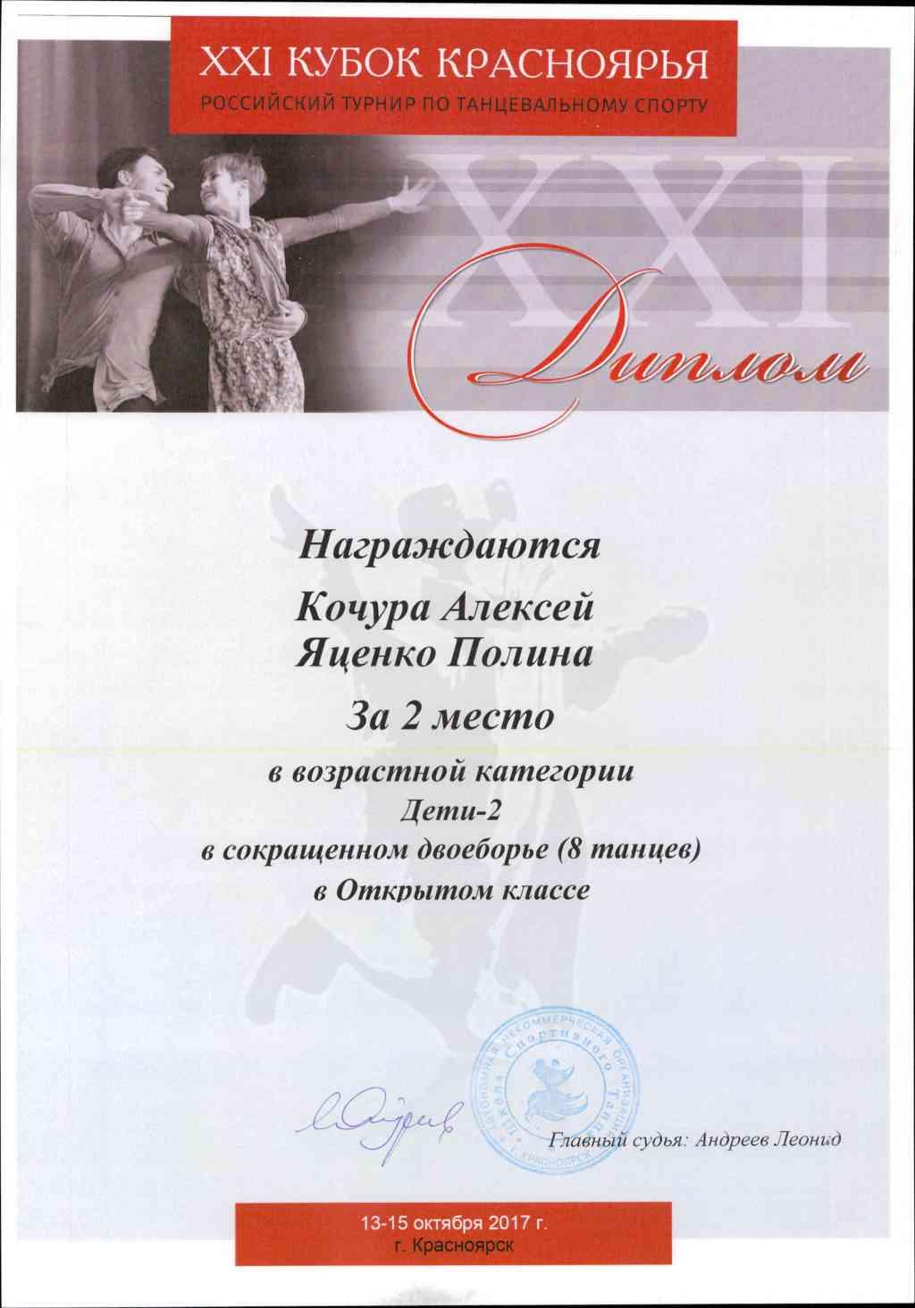 Сейчас Алексей и Полина  занимаются в  КГБОУДОД СДЮСШОР по ЛВС ОТС  «Локомотив», в  Красноярске. Его партнёрша, Полина Яценко, родилась в 2007г. Живёт в г. Красноярске, посещает гимназию № 13, ударница. Спортивными бальными танцами занимается с 5 лет. Пару Кочура- Яценко тренерует Владимир Сергеевич Филиппов. Побед и достижений за этот год у них  множество. Перечислим самые значимые: