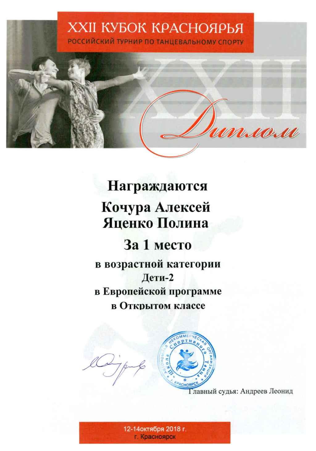 Занял 1 место в ХХII Российском турнире по танцевальному спорту «Кубок Красноярья-2018» в номинациях – Дети 10-11 лет в программах – Латиноамериканские и Европейские танцы.