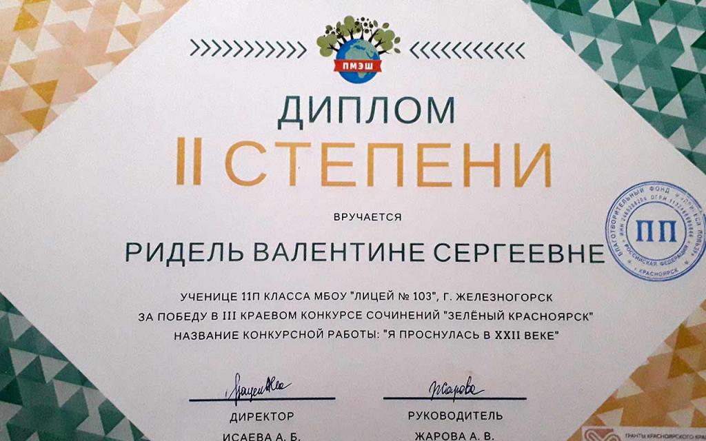 • Ридель Валентина, ученица 11 «П» класса нашего лицея стала победительницей III краевого конкурса сочинений «Зелёный Красноярск» с работой «Я проснулась в XXII веке»