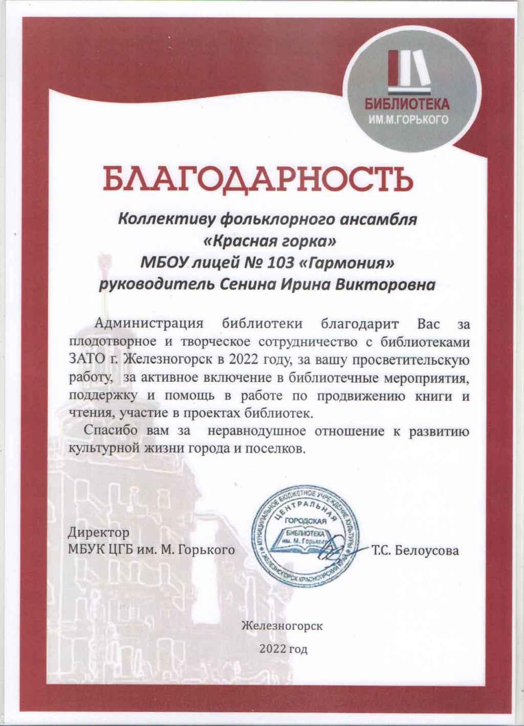 11.01.202327 декабря в Центральной городской библиотеке им. Горького состоялось награждение за сотрудничество партнеров библиотеки, в числе которых находился и фольклорный ансамбль «Красная горка».