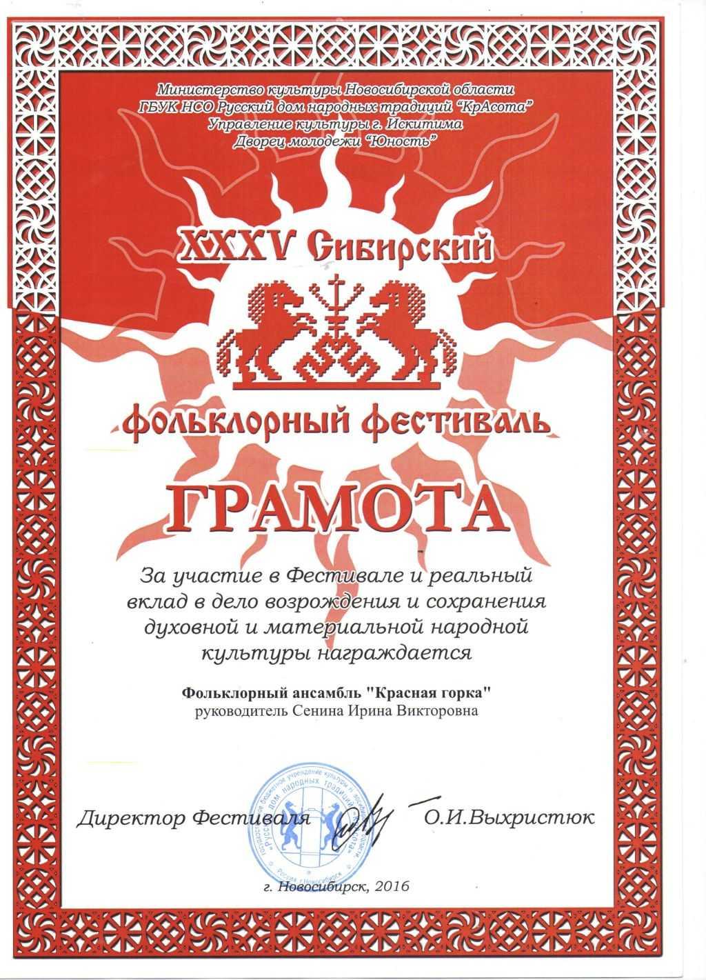 В этом же учебном году 11-13.11.16 в Новосибирске состоялся юбилейный  XXXV Сибирский Фольклорный Фестиваль, на котором  наш фольклорный ансамбль «Красная Горка» явился желанным гостем. Выступления «Красной Горки» явились украшением юбилейных фестивальных программ!