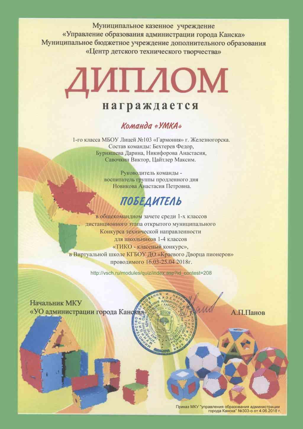 Команда «УМКА» 1-го класса МБОУ Лицей №103 «Гармония» г. Железногорска стала победителем дистанционного этапа конкурса в командном зачёте среди 1-х классов.