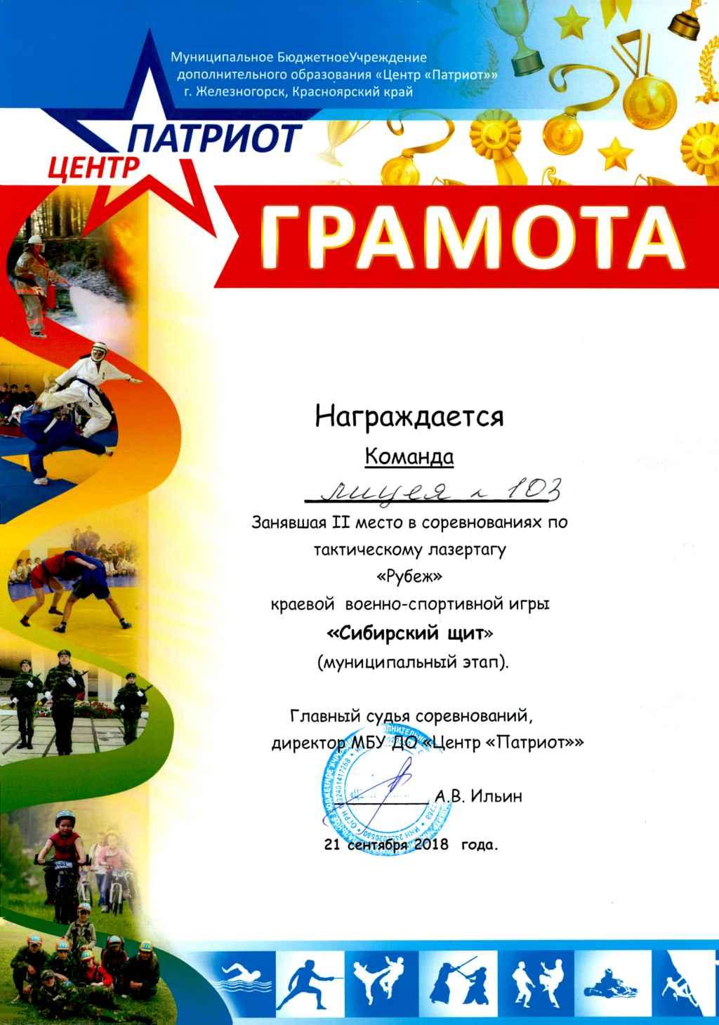 Команда Лицея: Константинов Данил, Уткин Михаил, Маковец Максим, Тарасенко Илья, Скворцов Владимир, Аксёнов Егор заняла призовые места в краевой военно-спортивной игре «Сибирский щит» (муниципальный этап).
