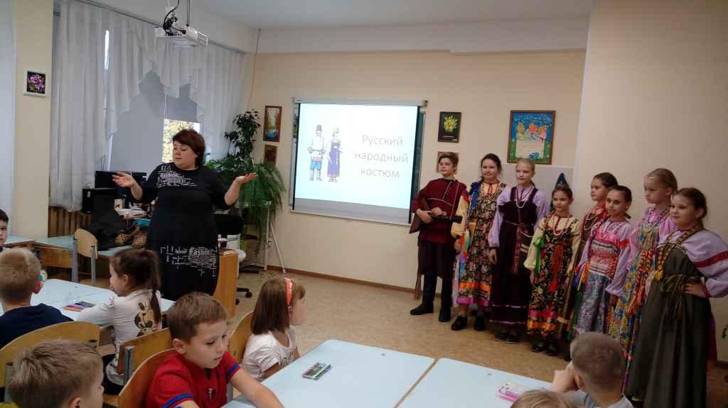 Мероприятие было посвящено истории и традициям русского костюма. Школьники и их родители познакомились с многообразием русского женского костюма и с особенностями мужского костюма, научились отличать праздничный костюм от повседневного. Своими руками могли потрогать праздничные женские сарафаны и мужские рубахи из фонда фольклорного ансамбля «Красная горка».  Дети познакомились с солярными – солнечными  знаками, украшающими русский костюм и оберегающими человека; увидели настоящие сапоги и лапти, а также, разнообразные кушаки, сплетённые мастерами. Девочкам очень понравились женские украшения – гайтаны и ожерелки. А мальчикам особое удовольствие доставила кукла - боец, сделанная участниками ансамбля. В завершении мероприятия, мастерски проведённого педагогами дополнительного образования Чихватовой О. К. и Сениной И. В., дети получили рисунки для раскрашивания и остались очень довольны!