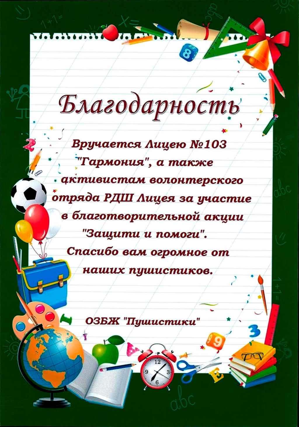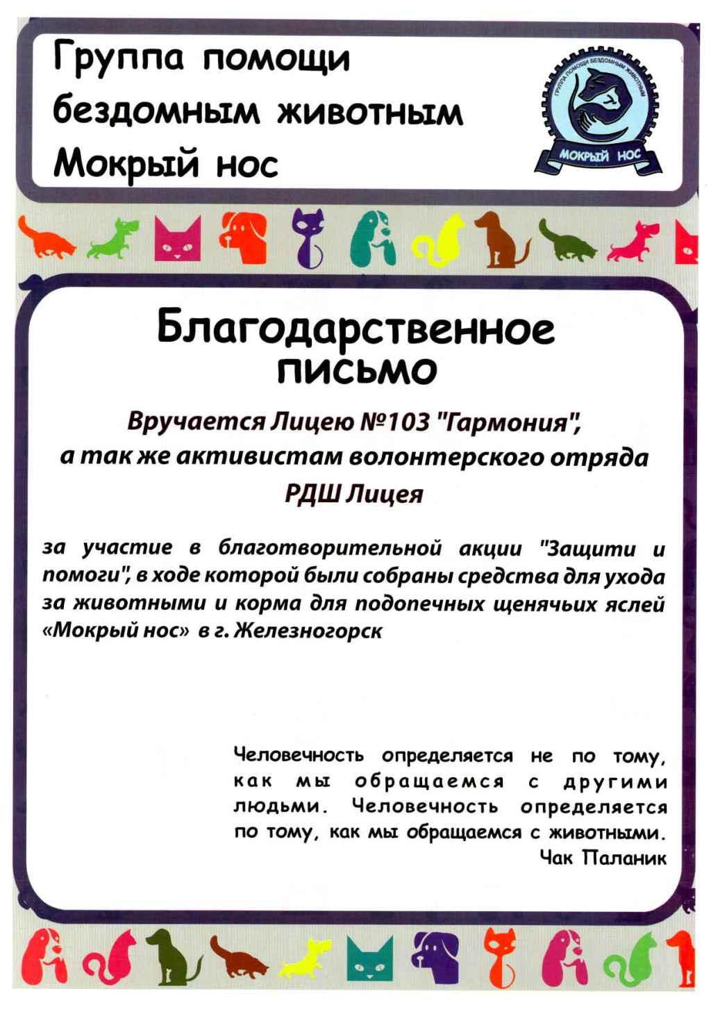 В Лицее с начала четверти проходила акция «Защити и помоги» по сбору кормов для животных в приюты. Силами всех неравнодушных учащихся мы собрали около 160 килограммов корма. Поскольку на территории нашего города существует общество по защите бездомных животных «Пушистики», а так же действующий приют для бездомных собак и кошек «Мокрый нос» (на его территории уже содержатся 52 собаки), было принято решение передать корма в обе организации и накормить всех бездомных.