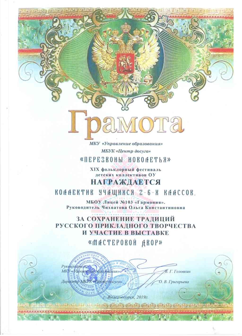 5-6 марта вМБУК «Центр Досуга» состоялся XVIX городской фольклорный фестиваль «Перезвоны Новолетья». Фольклорный ансамбль «Красная горка» представил зрителям фестиваля разнообразную концертную программу, включающую в себя различные вокальные и хореографические жанры (скоморошина, былина, кадриль, протяжная лирическая, свадебная) и был награжден дипломом 1 степени в номинации «Мастера» (старшая группа) и дипломом 1 степени в номинации «Песенно – обрядовый фольклор» (младшая группа). Учителя, педагоги и учащиеся лицея оформили замечательную выставку «Мастеровой двор», за которую были отмечены грамотами за сохранение традиций русского прикладного творчества (Ломакина Г. Н., Ошкина Л.В., Сенина И.В., Чихватова О.К., Титова Л.В., Чумичев А.Ю.). Ярко и эмоционально выступили в конкурсе «Русская коса – девичья краса» Баева Анастасия и Смирнова Софья. За творческие успехи и верность русскому фольклору многие участники фольклорного ансамбля были удостоены персональных грамот (Шабанова Диана(9а), Дутова Полина (8а), Вайзбек Максим, Пушков Алексей (7м), Смирнова Софья (7а), Баева Анастасия(5а), Макарова Юлия, Протопопова Вероника, Франтикова Валерия (5д).