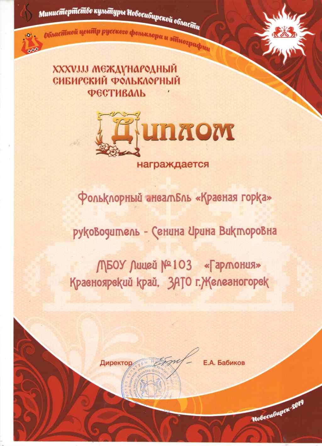 В этом году фестиваль обрел статус международного - вместе с коллективами Сибирского региона в нём принимали участие коллективы из Турции, Украины и Казахстана. Наш ансамбль «Красная Горка»  великолепно  представил на фестивале  Ангарскую   лирическую традицию, снискав у зрителей заслуженные аплодисменты. Сибирский фольклорный фестиваль на протяжении многих лет проходит с аншлагом  - и очень приятно, что в этом году право открытия  и закрытия  фестиваля  доверили нашему  коллективу. Лицей 103,  г. Железногорск, и весь Красноярский край представляли наша десятиклассница Шабанова Диана (10П), чей красивый голос был отмечен всеми участниками фестиваля,  и замечательные  выпускницы лицея Жбанова Карина   и Сенниковская  Дарёна, гордо несущие знамя традиционной культуры!