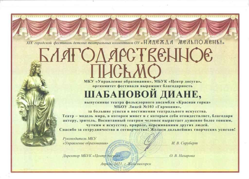 На суд жюри были представлены русские народные сказки, разыгранные в фольклорной экспедиции «Живая старина». Лучшие артисты (Дутова Полина, Смирнова Софья, Вайзбек Максим) были награждены грамотами за творческие успехи, а выпускница Лицея Шабанова Диана- благодарственным письмом за большие успехи в постижении театрального искусства. Браво артистам!