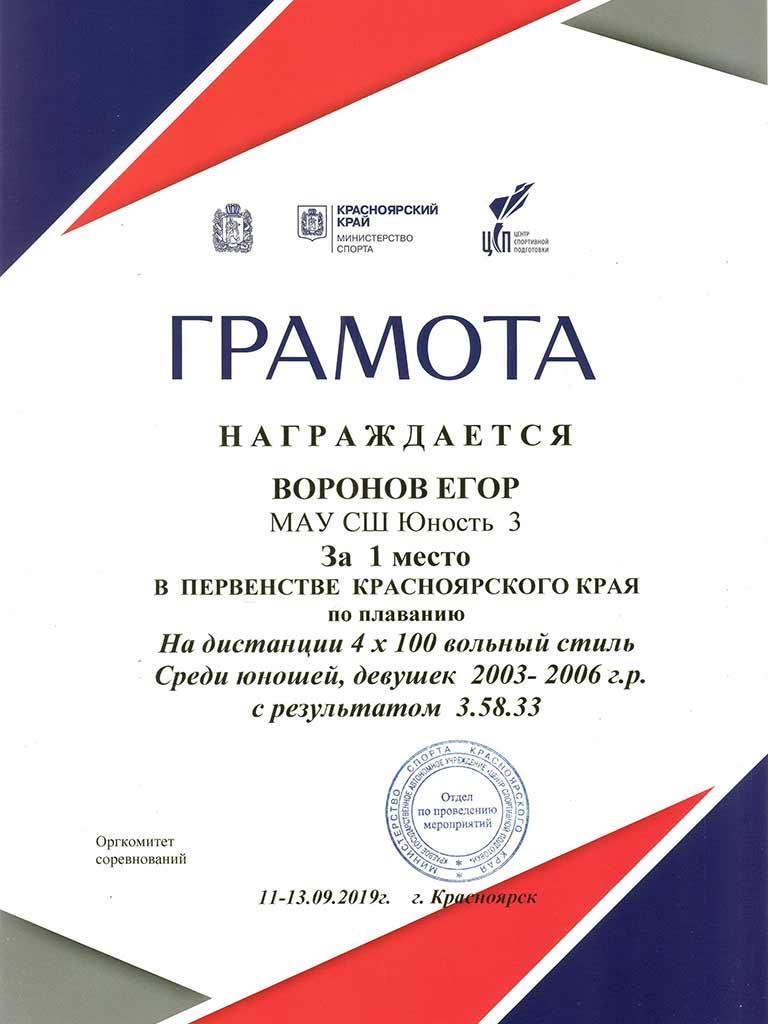Довольно успешно начали учебный 2019 – 2020 год ребята 9 «М» класса. В первый месяц осени парни завоевали несколько спортивных побед. С 11 по 14 сентября в г. Красноярске состоялись Чемпионат и Первенство Красноярского края по плаванию. Обойдя сотню претендентов на победу, наш ученик Воронов Егор занял 1 место на дистанции 4 по 100 вольным стилем и ещё несколько призовых мест. Эти высокие результаты подтвердили июльский успех Егора на Кубке стайера – 1 место по плаванию на открытой воде на дистанции 1500 метров.